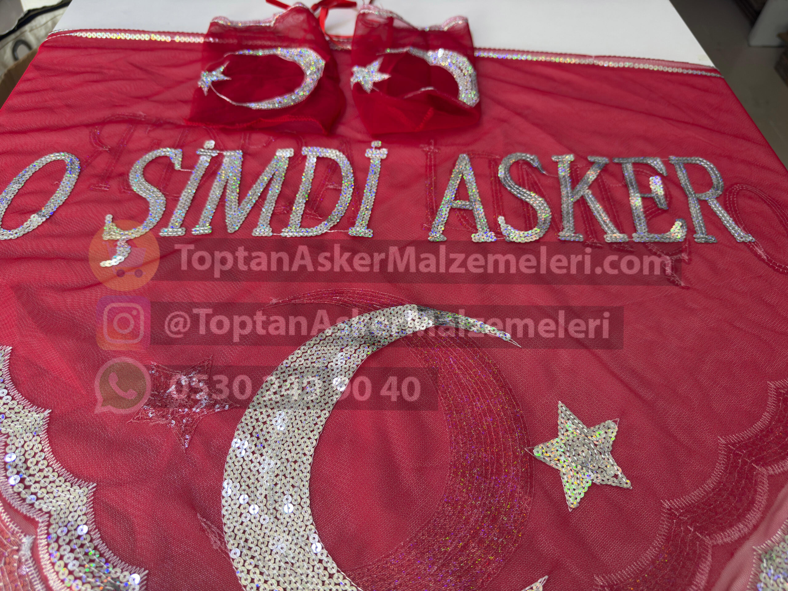 Kırmızı “O Şimdi Asker” yazılı şal ve kına eldiveni seti, her asker eğlencesine anlam ve estetik katar. Toptan alımlarınızda uygun fiyat ve kaliteli ürün garantisiyle hizmet veren toptanaskermalzemeleri.com ile çalışarak siz de fark yaratabilirsiniz.