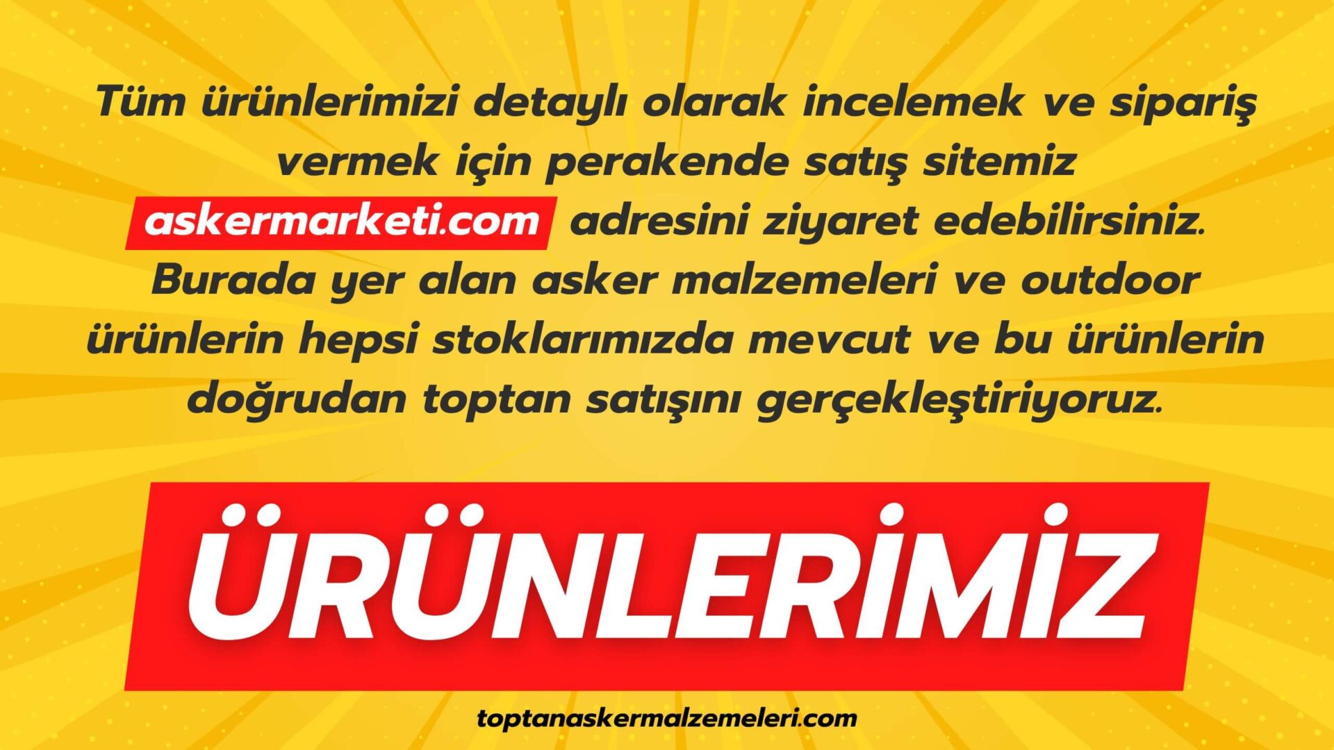 Tüm ürünlerimizi detaylı olarak incelemek ve sipariş vermek için perakende satış sitemiz askermarketi.com adresini ziyaret edebilirsiniz. Burada yer alan asker malzemeleri ve outdoor ürünlerin hepsi stoklarımızda mevcut ve bu ürünlerin %95’inin doğrudan toptan satışını gerçekleştiriyoruz.